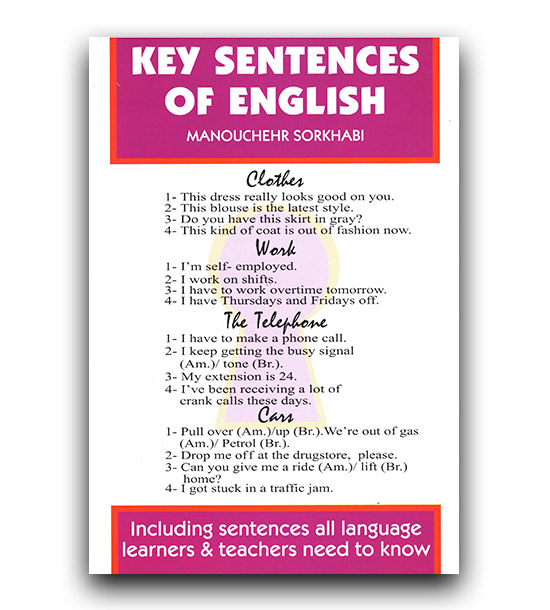 در این کتاب مجموعه ای از جملات کلیدی زبان انگلیسی جمع آوری و طبقه بندی شده است. سطح کتاب طوری تنظیم شده است که از جملات ساده و پایه ای زبان انگلیسی تا جملات اصطلاحی مشکل را در برگیرد تا هر زبان آموزی با توجه به سطح زبان خود بتواند از کتاب استفاده کند.