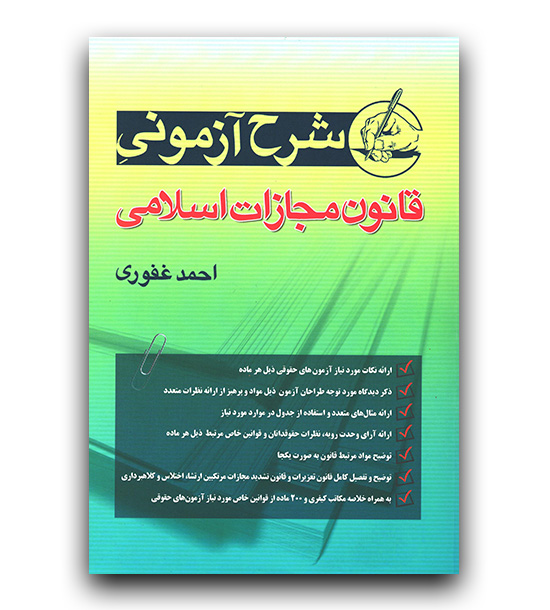 کتاب شرح آزمونی قانون مجازات اسلامی که بر اساس نظم مواد قانون مجازات اسلامی جدید به انضمام بخش تعزیرات قانون مصوب 1375 تدوین شده است، نکات مورد نیاز آزمون های حقوقی و دیدگاه های مورد توجه طراحان سوال را در ذیل هر ماده ارائه نموده است. همچنین آرای وحدت رویه و قوانین خاص مرتبط نیز ارائه شده است.